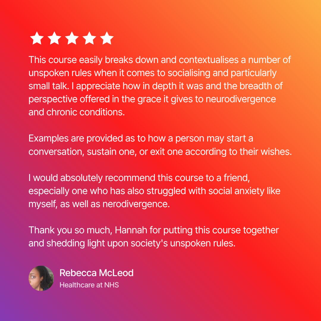 As a young adult, Hannah struggled hugely to cope in social situations, especially with people she didn't know. Putting her foot in it, missing important social cues, oversharing, talking too much, and using humour to cover up her discomfort were commonplace, and she often felt awkward, misunderstood and alone. In this ground-breaking course, Hannah shares the secrets of her own transformation - and plenty more besides!