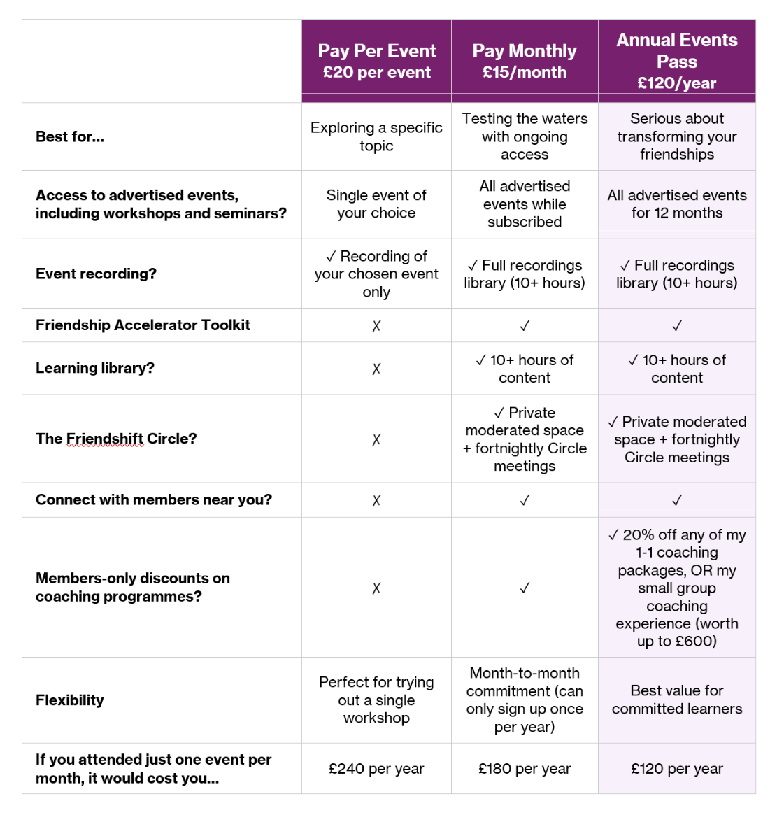 It's a smart investment in yourself - and in your friendship-building journey. For the price of just 6 individual events (£120), you get unlimited access to every single event that I'll be running throughout 2026 (and into 2027 depending on when you buy your plan) - plus additional resources and community support that aren't available anywhere else.
